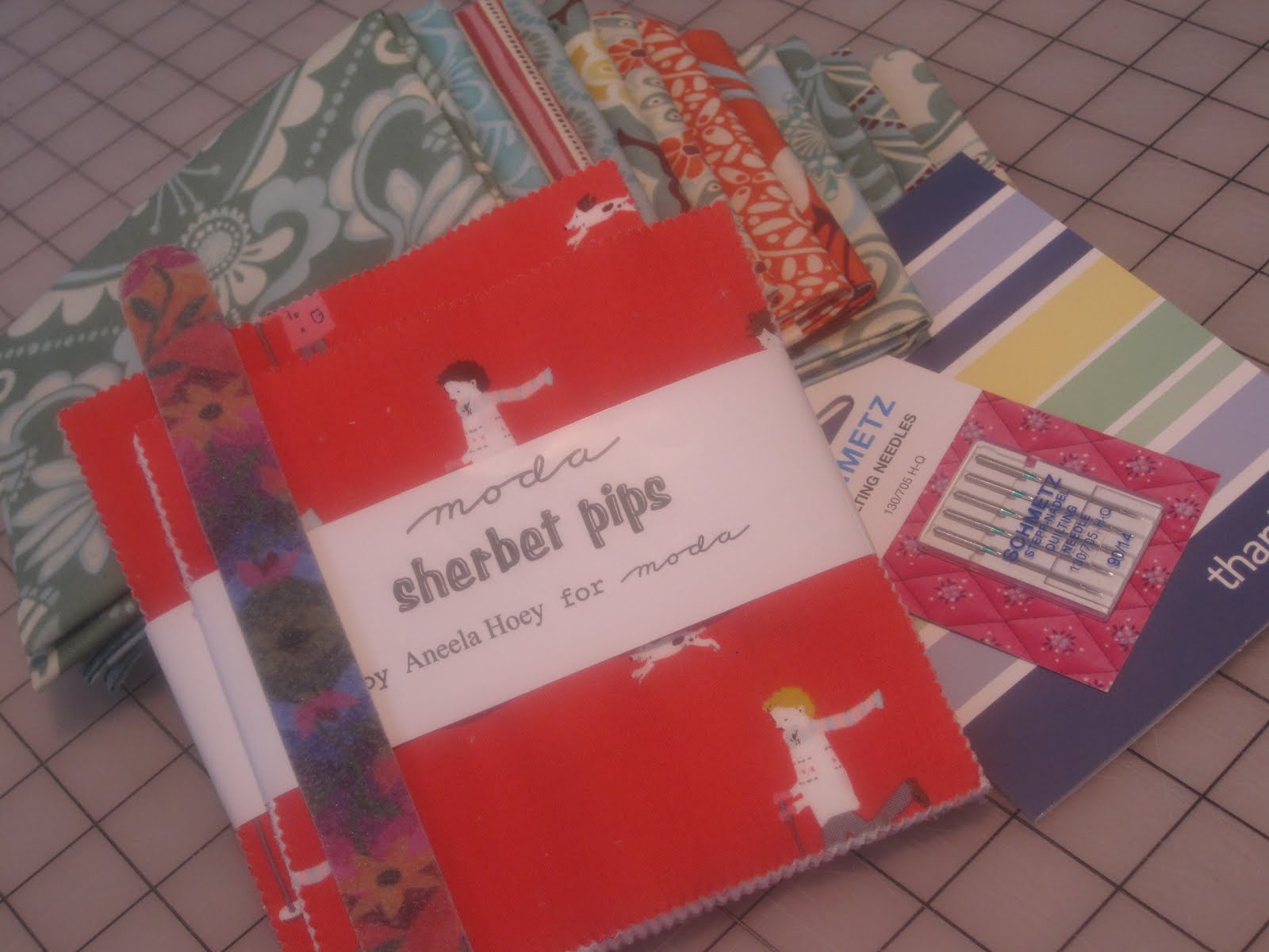 i picked up some Fandango fat quarters at a screamin deal from 1 Choice 4 Quilting & i also got 2 charm packs of Sherbet Pips at a great deal as well. the package arrived & it had some extras in it. i got a nail file as well as a package of quilting needles along with a thank you card. very impressive service & again a screamin deal.