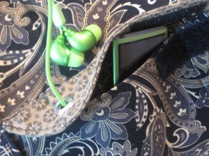 on one of the sides there is a pocket that is divided in the middle. the flap has a grommet in it so your headphones can come through it & your music player is safe inside.